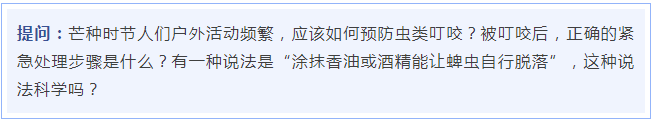 芒種時節(jié)戶外活動需要警惕蚊蟲、蜱蟲、恙螨和隱翅蟲等侵襲。蜱蟲吸附皮膚,吸血后體積非常大,往往超過它們身體的5倍以上,它的唾液里往往攜帶多種導致萊姆病、森林腦炎、發(fā)熱伴血小板減少綜合征等疾病的病原體;恙螨幼蟲藏在草葉腐土中,人被叮咬后,皮膚上會形成綠豆大小的紅腫水泡,中間可能有焦痂;隱翅蟲體液接觸皮膚會引起條狀潰爛。這些蟲子在氣溫25攝氏度、濕度80%的潮濕環(huán)境中最活躍,尤其喜歡棲息在高草區(qū)、灌木叢和積水附近。