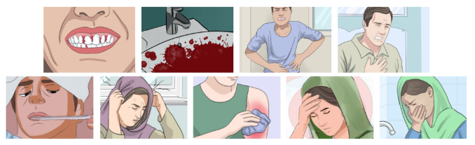 感染登革熱重癥的癥狀包括牙齦出血、嘔血、劇烈腹痛和呼吸急促(上排);輕癥癥狀包括持續(xù)高燒、頭痛、肌痛、疲勞和持續(xù)嘔吐(下排)