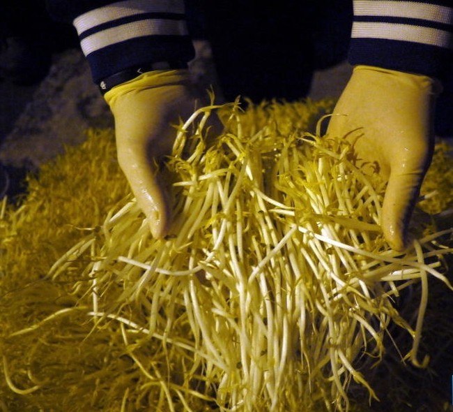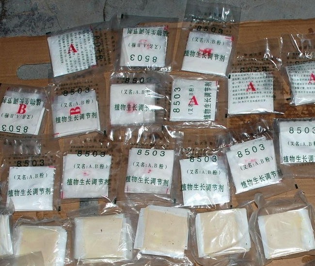 據嫌犯楊某隆和潘某棉等人交待,沒有添加劑的豆芽往往要10多天才會長成,且細和短,容易出根,味道有些苦,培育成本高,成活率低。兩團伙用石灰粉兌水代替消毒水,添加無根劑、A B粉,用頭孢(抗生素)等添加劑催產。這樣豆芽生產周期只要6天,且顏色白凈,水分豐富,形態(tài)美觀,不易生根,比較壯,沒黑點,能夠保持亮度,比較甜。