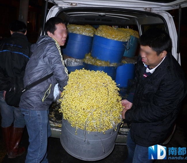 3月5日凌晨5時24分,海珠金溪農貿市場門前,埋伏一夜的干警截獲一輛滿載上千公斤毒豆芽的面包車。南都記者 馬強 攝